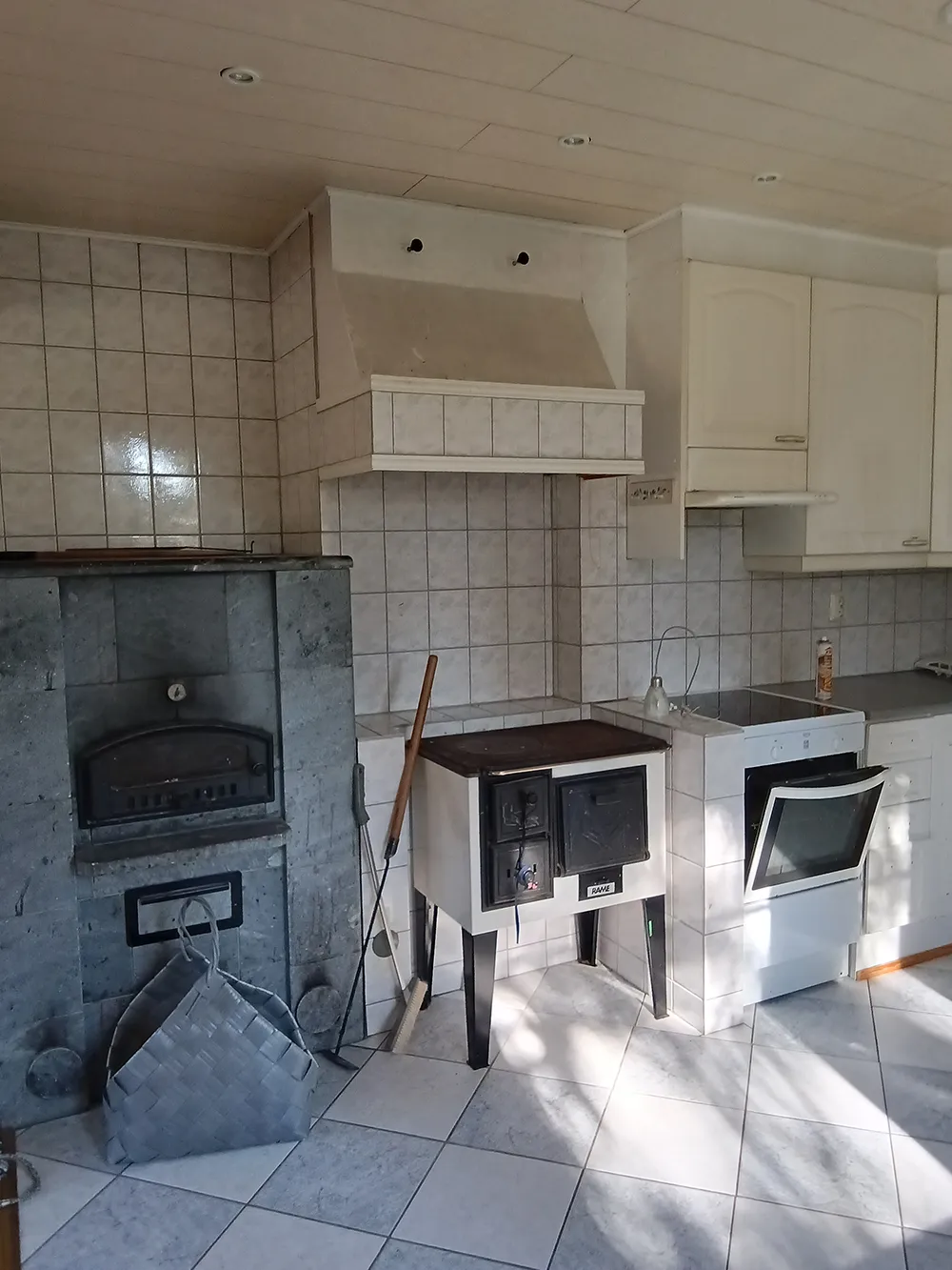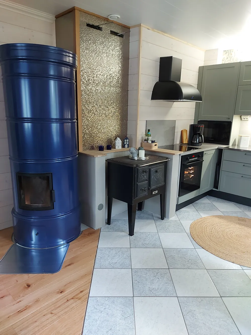 Yksi suurimmista muutoksista oli vanhan leivinuunin purku. Sen tilalle nousi upea Aino-pönttöuuni mustikan sävyssä, joka toimii keittiön näyttävänä katseenvangitsijana. Myös perinteinen puuhella sai jäädä paikoilleen, mutta se sai remontissa uuden värin pintaansa. Puuhellan päältä poistettiin vanha huuva, ja hormiin toteutettiin näyttävä laattapinta, joka tuo tilaan modernia särmää.