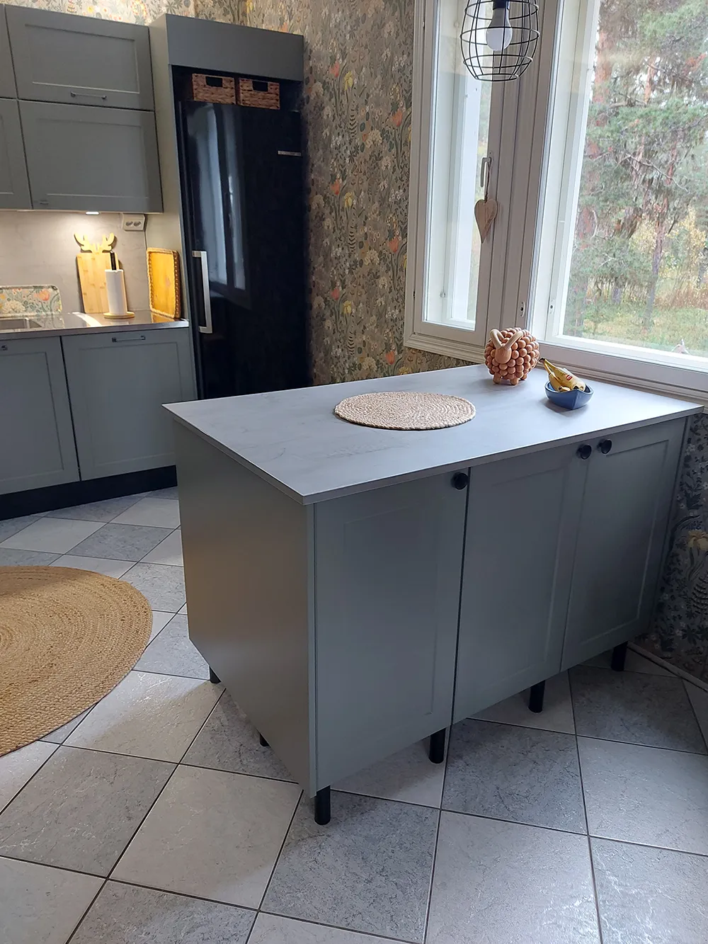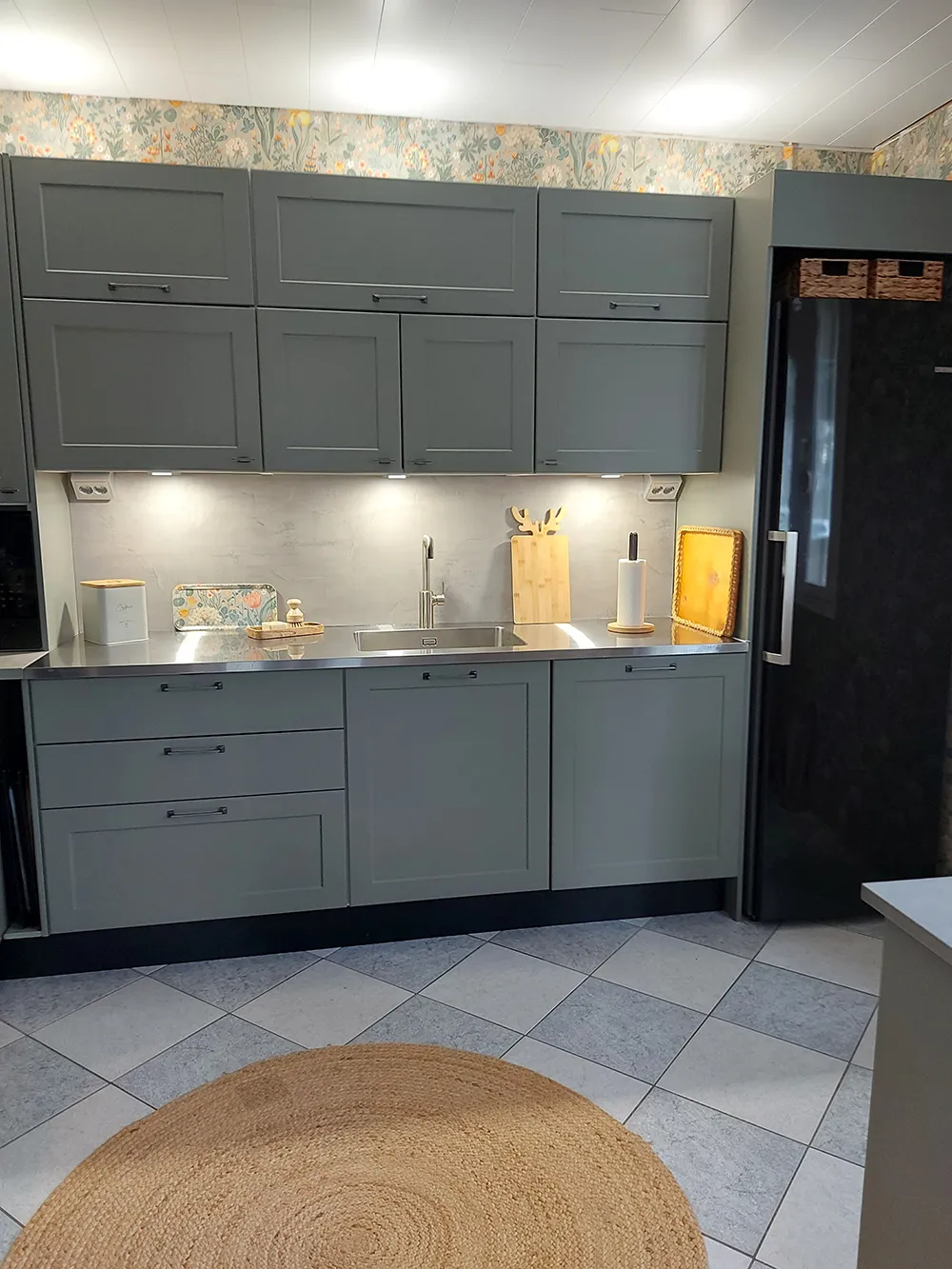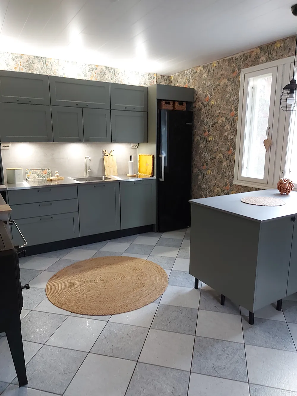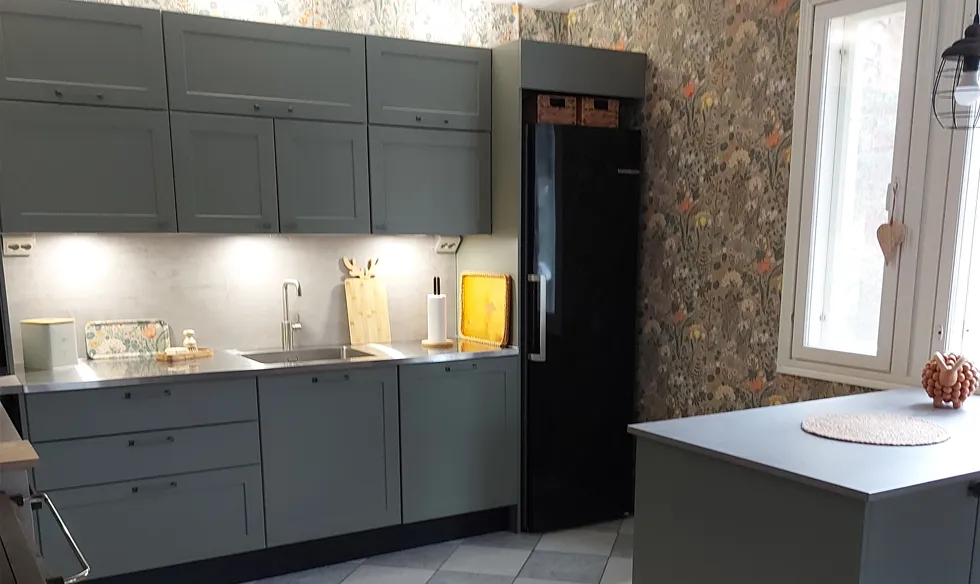 Kaikki pinnat uusittiin hyväkuntoista laattalattiaa lukuun ottamatta. Erityisesti katse kiinnittyy seinien Boråstapeterin Blomsterhav-tapettiin, jonka kukkakuosi tuo keittiöön lämpöä ja persoonallisuutta. Yksityiskohdissa on mietitty käytännöllisyyttä: alakulmaan asennettiin kätevä LeMans-kulmamekanismi, ja pienikin hukkatila hyödynnettiin fiksulla uunipeltien säilytyslokerolla.