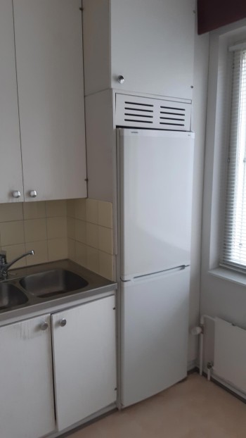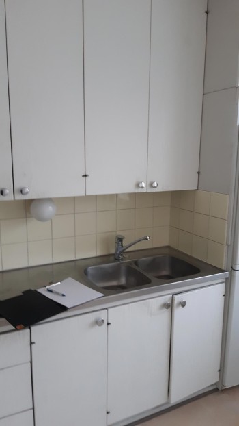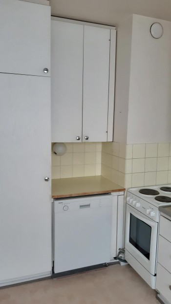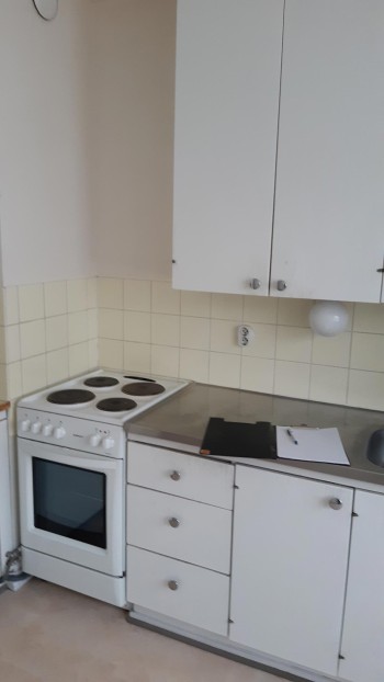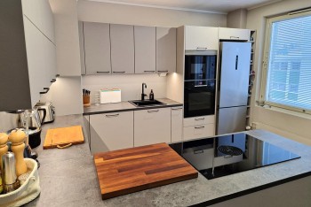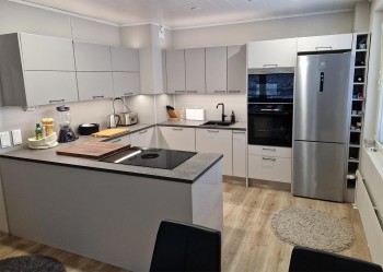 Tässä kohteessa keittiö koki suuren muutoksen. Vanha oviaukko poistettiin, sekä samalla olohuoneen ja keittiön välinen seinä kaadettiin.