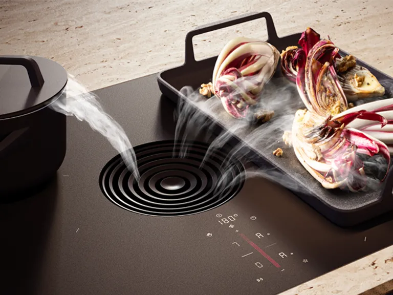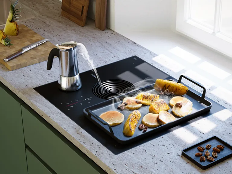 Kompakti järjestelmä, jossa kaksi rajatonta induktiokeittoaluetta oikealla ja kaksi induktiokeittoaluetta vasemmalla. Intuitiivinen, digitaalinen näyttö helpoilla sormenliikkeillä moniväristä sControl+-säädinaluetta käyttämällä. Kiertoilmakäytössä hajut neutralisoidaan huipputehokkaalla hajusuodattimella.